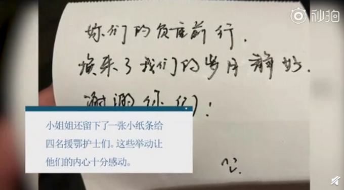 一位坐在隔壁桌的陌生女孩听到后,偷偷帮她们买完单就走了,只留下一张小纸条:你们的负重前行,换来了我们的岁月静好,谢谢你们。