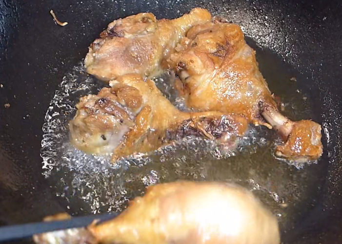 第三步:之后我们把锅里的油加热至八成热,把炸过一遍的鸡腿再次放入锅中,快炸40秒,迅速捞出控油。这样一道外焦里嫩的鸡腿就完美成型啦!