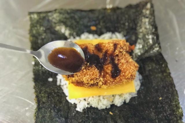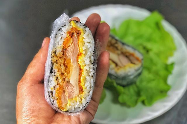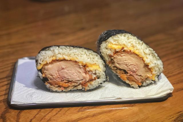 做好的炸鸡排免捏饭团看上去有一点像汉堡,白饭包裹着鸡排,外酥里嫩,又有很多的酱汁,非常下饭!