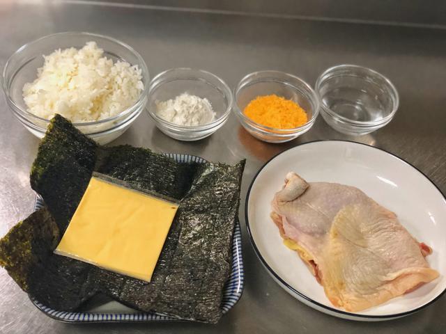 制作炸鸡排免捏饭团(2人份)需要的食材有米饭240克,高筋面粉30克,面包糠一小碗,清水30克,海苔2张,芝士2片,去骨鸡腿肉一片。