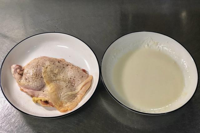 把腌制好的鸡腿肉放入调制好的面糊中,上下都均匀包裹上。
