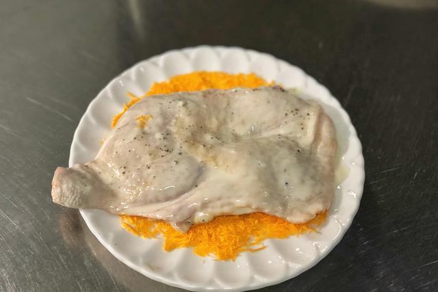 铺上一层芝士片,然后把切好的鸡排拿出一半放在上面,根据自己的口味需要添加适量的猪排酱。