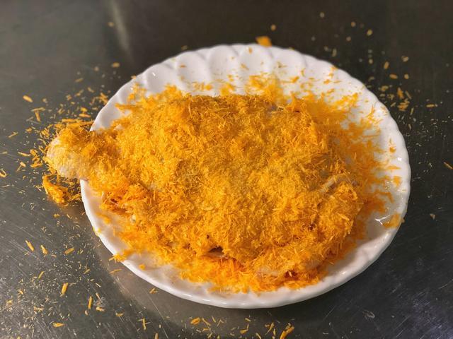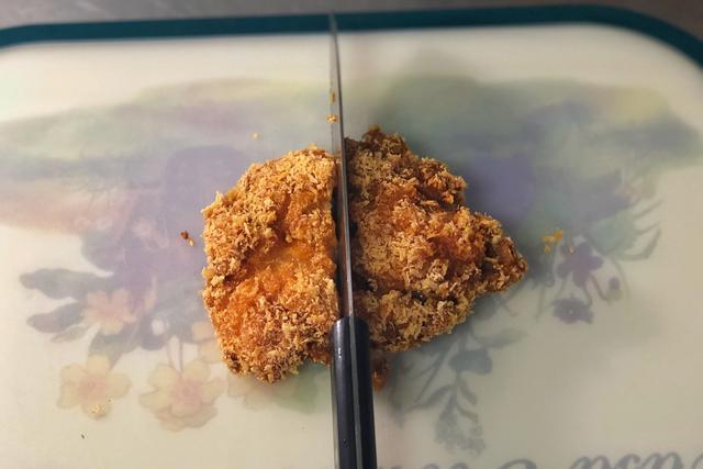 炸好的鸡排用刀外酥里嫩,刀子一切两半的时候,那种清脆的嘎吱声,就已经让人很销魂了,放在盘子当中备用。