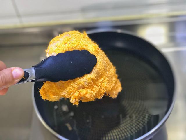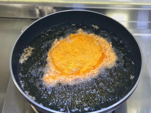 当底部炸至金黄的时候,用夹子翻面,中小火炸6分钟,两面全部金黄的时候基本上就已经熟了。如果喜欢吃火大的,可以多炸一会儿。