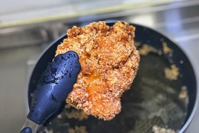 平底锅中倒入大约2厘米厚的食用油。油温的测试有两种方法,第一种方法可以把筷子放进去往上冒小泡,这个时候的油温大约是在180度,第二种方法就是把面包糠放进去,一下子从底部飘上来并且轻微冒泡,就可以把鸡排放进去炸,来回转一下,以防粘锅底。这个动作一定要注意安全,以防油溅到手上。