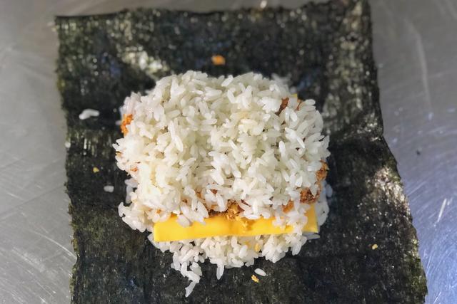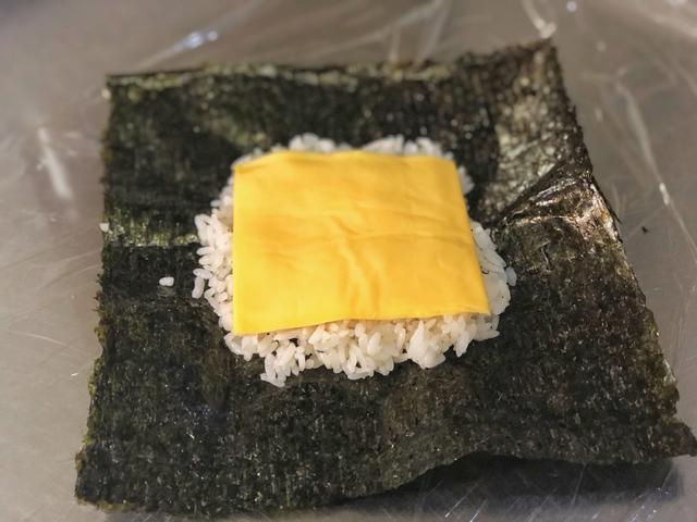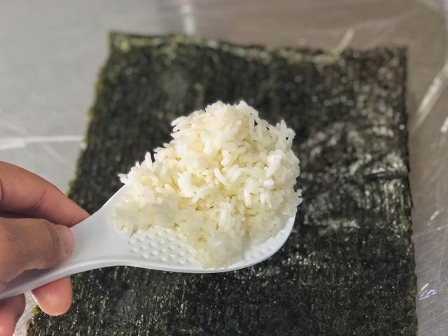 铺上一层保鲜膜,把海苔片放在保鲜膜中间,准备热米饭60克,均匀铺在海苔中间,如果觉得米饭粘手,可以在接触米饭之前手上用清水打湿。