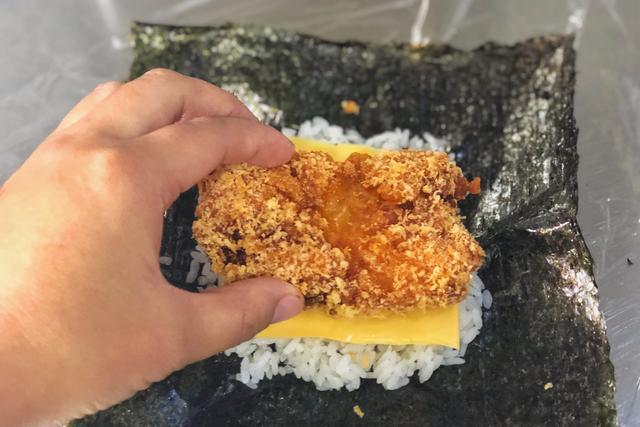做好的饭团营养健康,米饭夹杂着猪排酱的汁液,咬一口下去鸡排的酥脆声,非常得满足。食用的时候,把保鲜膜拿掉即可。如果要切开的话,可以连同保鲜膜一起切,这样操作会更方便。