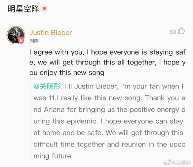 而就是这样一位“奇女子”也有自己喜欢的偶像,那就是贾斯汀比伯。5月8日,贾斯汀・比伯与“A妹”爱莉安娜・格兰德合作全新公益单曲《Stuck With Me》发行,同时曝光MV,引发众粉丝期待。作为比伯迷妹的关晓彤也准时上线追星。关晓彤在比伯新歌相关推文下留言,在表示很喜欢这首正能量的新歌之余,晓彤还告诉比伯自己从11岁开始就是他的粉丝。意外遭到了贾斯汀的翻牌!