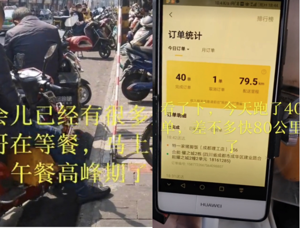 她骄傲地晒出自己的订单,跑了79.5km,送了40单。一天的辛苦,想到会变成孩子碗里的饭菜,就值得了。