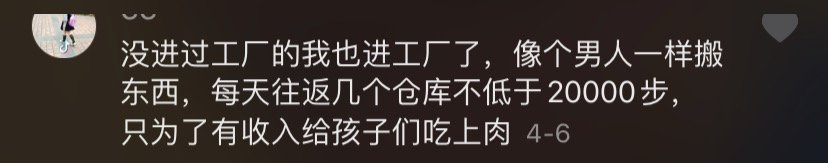 「没进过工厂的我也进工厂了,像个男人一样搬东西,每天往返几个仓库不低于20000步,只为了有收入给孩子们吃上肉。」