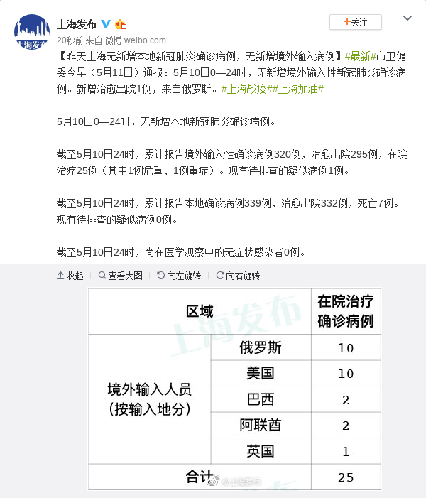 市卫健委今早(5月11日)通报:5月10日0—24时,无新增境外输入性新冠肺炎确诊病例。新增治愈出院1例,来自俄罗斯。