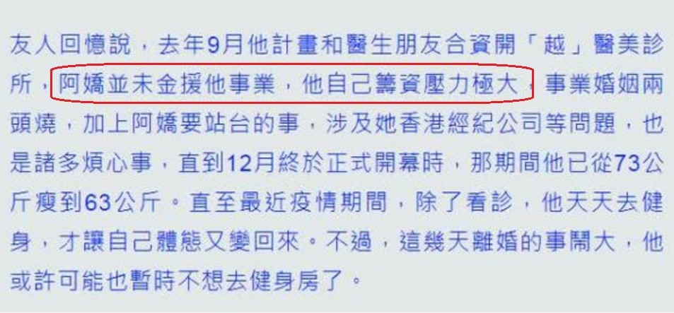 赖弘国好友:阿国真的很伤心,他开始从70多公斤的体重,他如今只有60多公斤了,瘦了足足差不多30斤。他一直在保持着健身,这是他唯一的爱好,如今发生了离婚的事情,他几乎连唯一的爱好都没有了兴趣。