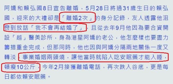 据赖弘国好友透露,阿娇的离开让赖弘国无法接受,而且他自己的事业压力也是极大的。在开展自己的事业时,他也是为了阿娇才独自做事业的。但实际上阿娇作为妻子,并没有帮助过他。
