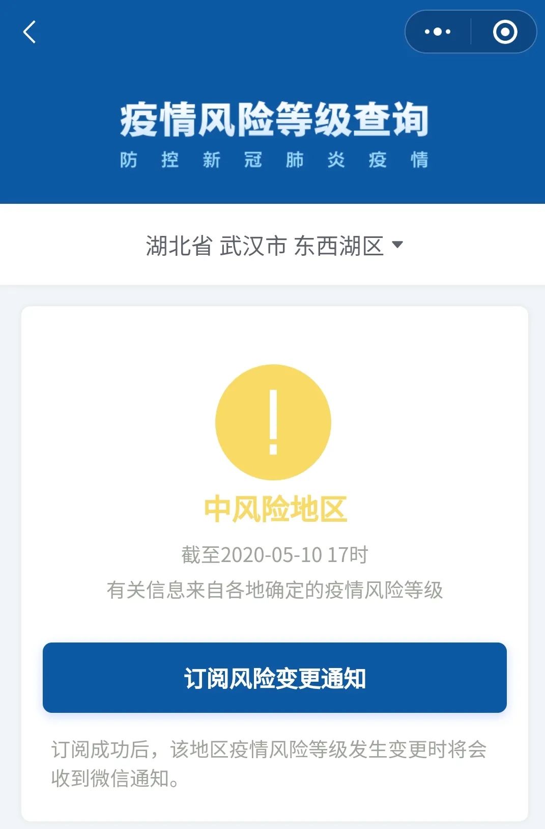 截至5月10日下午17时,东西湖区的风险等级已升为中风险。