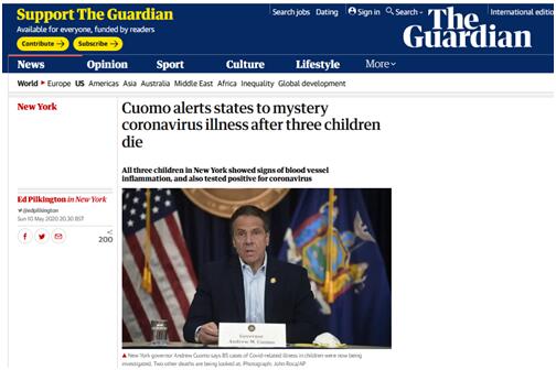 [环球网报道 记者 张晓雅]美国纽约州已有85名儿童出现似乎与感染新冠病毒相关的不明病症,且造成至少1人死亡,另有2人具体死因正在调查中。英国《卫报》报道称,当地时间10日,纽约州州长安德鲁•科莫就此向各州发出警告。