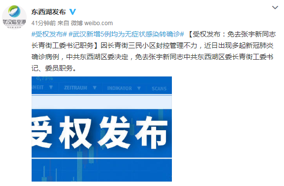 5月11日,武汉东西湖区人民政府官方微博发布消息,因长青街三民小区封控管理不力,近日出现多起新冠肺炎确诊病例,中共东西湖区委决定,免去张宇新同志中共东西湖区委长青街工委书记、委员职务。