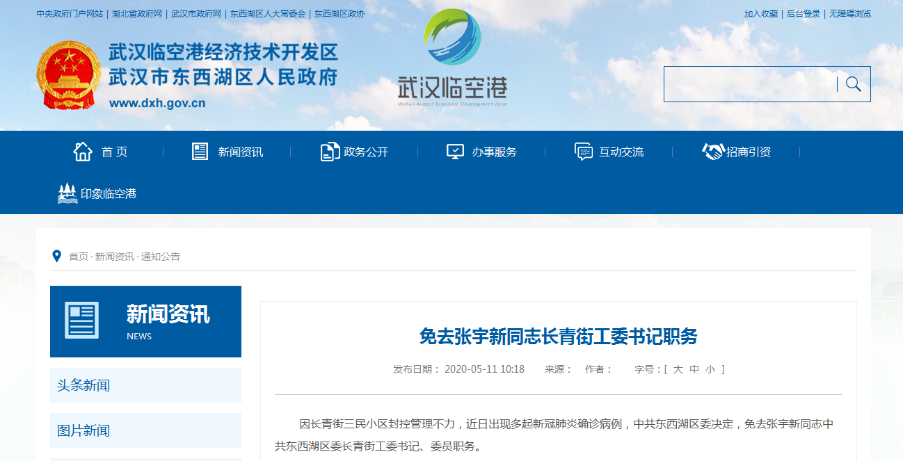 据武汉东西湖区人民政府网站,因长青街三民小区封控管理不力,近日出现多起新冠肺炎确诊病例,中共东西湖区委决定,免去张宇新同志中共东西湖区委长青街工委书记、委员职务。