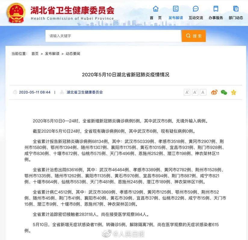 5月11日,据武汉卫健委官网消息,5月10日0-24时,武汉新增新冠肺炎确诊病例5例。