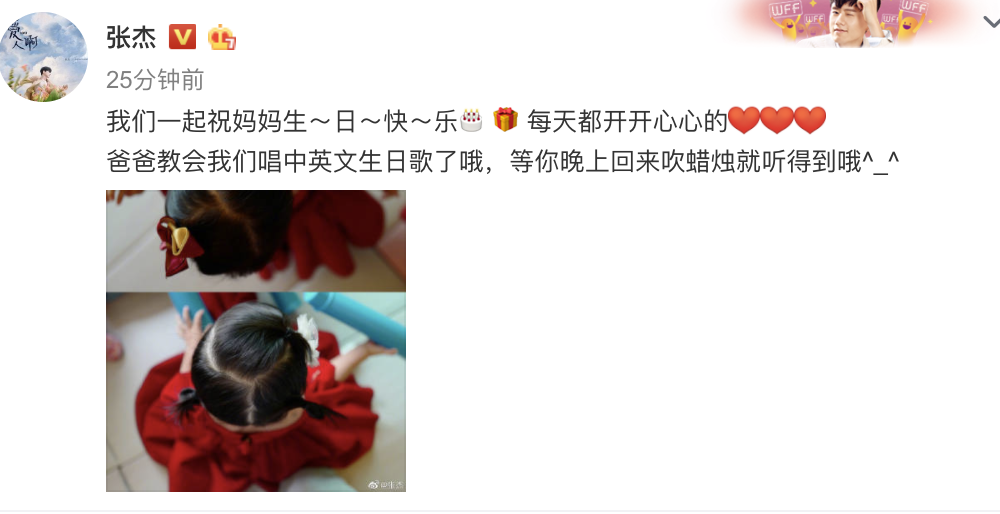 张杰发文“我们一起祝妈妈生日快乐每天都开开心心的,爸爸教会我们唱中英文生日歌了哦,等你晚上回来吹蜡烛就听得到哦”,这次的祝福语信息量很大,首先是带着孩子们一起送出生日祝福,然后是以孩子们的口吻透露了跳跳俏俏准备的惊喜,孩子们太小还不会送礼物,但是张杰教会了女儿们唱中英文生日歌,这就是最大的生日惊喜了。最后还透露了一点,谢娜因为工作原因不能在家过生日,要晚上才能回来吹蜡烛,所以现在是张杰在家带孩子,等着谢娜回家。