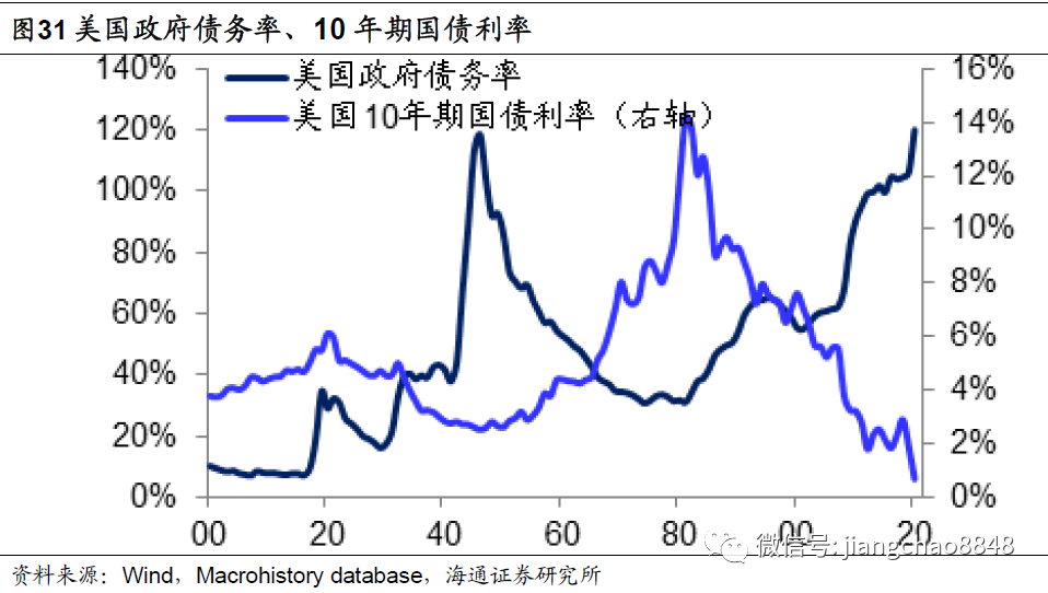 现在很多人判断低利率的理由在于高债务压力,各国政府为了偿债,只能保持低利率。但其实历史上也曾出现过高债务的时期,其中最为典型的是二战结束之后,当时美国的政府债务率高达120%,英国甚至超过200%,但是在1950年之后,利率并非持续下降,而是逐渐回升。