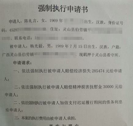 (荔枝新闻从受害人家属处获得一份强制执行申请书上显示,受害人家属围绕经济赔偿损失与精神赔偿损害共索赔315474元)