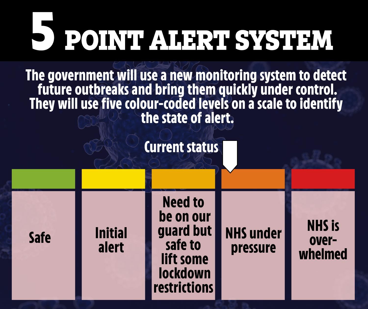 英国首相鲍里斯·约翰逊(Boris Johnson)将在周日的讲话中公布一个新的病毒警报系统,类似于英国目前传达恐怖威胁级别的方式,该系统将为取消对经济的限制设定一些条件。该警报设定为从1级(绿色)到5级(红色),绿色表示生活可以恢复正常。