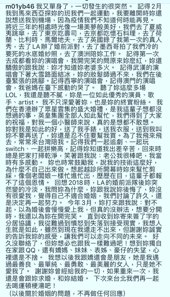霍汶希表示,阿娇与赖弘国约定几个月后才公开消息,就是为了挽回这段婚姻,但男方却对媒体承认了婚变,阿娇不得不回应“在3月签了分居协议”。