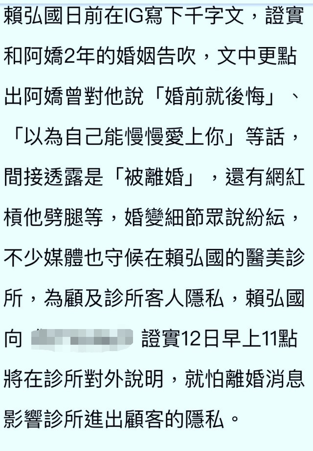 赖弘国虽然不是明星,但他去年十月开了自己的诊所,拥有很多名媛千金以及明星客户,为了留着这批客户,他不得不一次又一次解释,说自己没有出轨,态度强硬,对那些指控他出轨的网红提告。