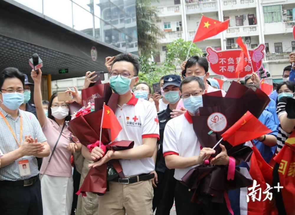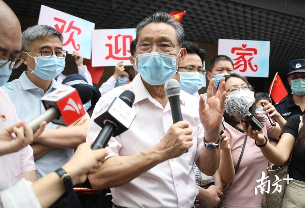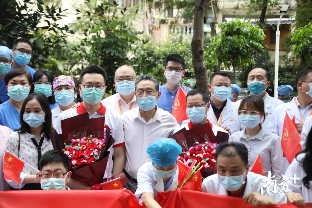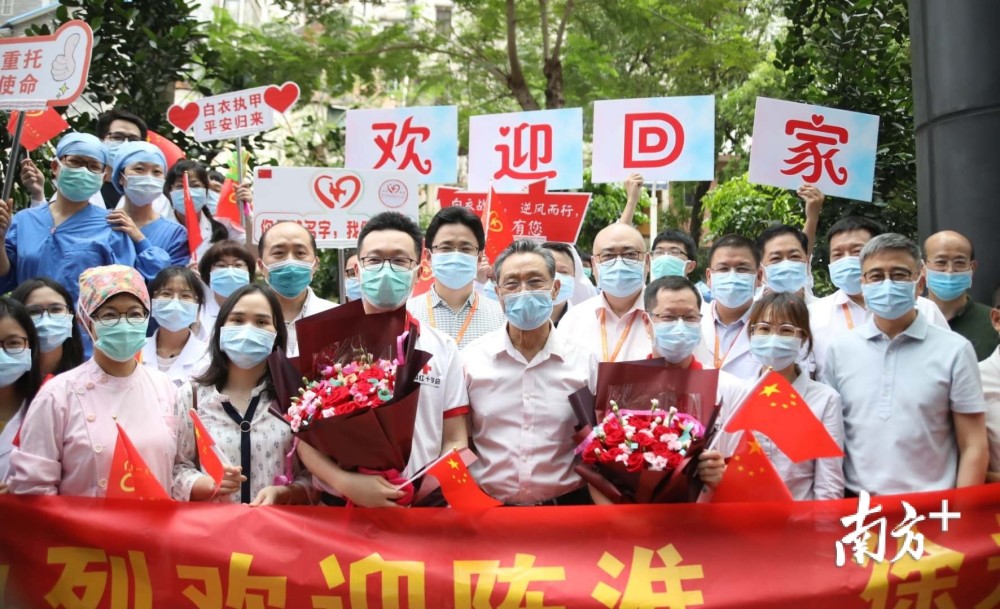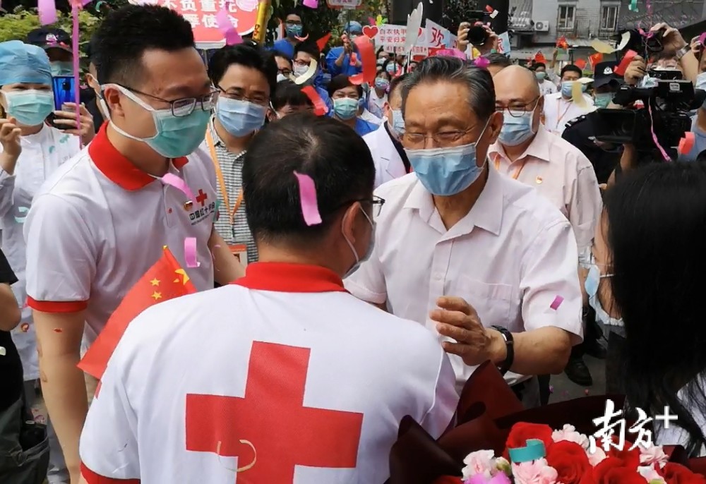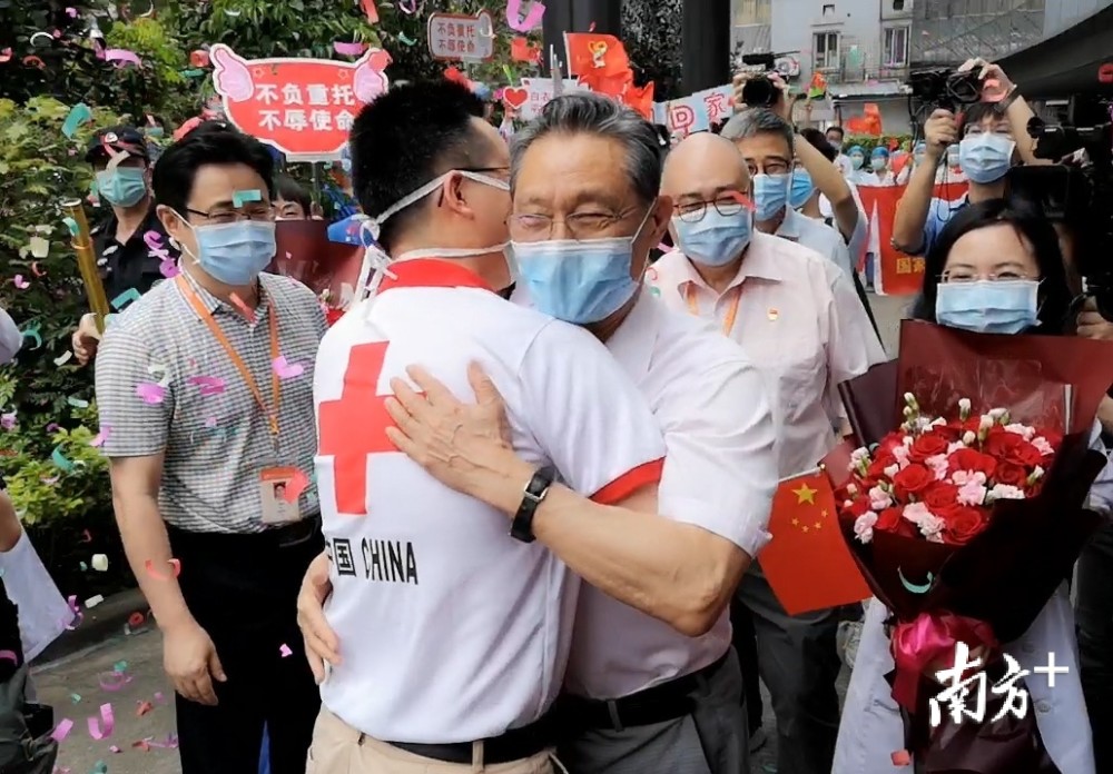 钟南山院士、广医一院党委书记黎毅敏和广医一院的医务人员在医院迎接两位医生。钟南山带着笑容与两位医生拥抱,他表示,徐永昊和陈淮不辱使命,不负重托,圆满完成了援助伊拉克的工作。希望两位医生回来后继续努力,为疫情防控工作继续贡献力量。