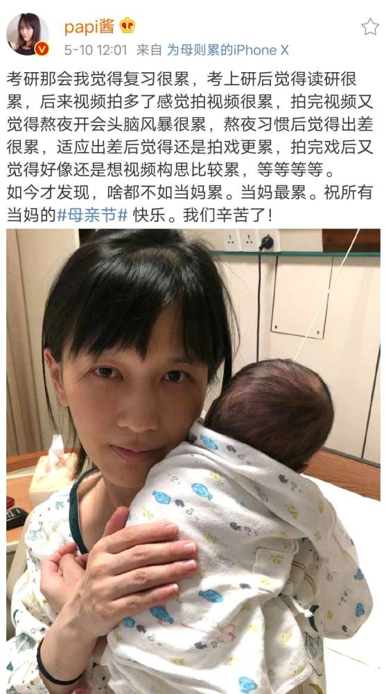 5月10日母亲节,papi酱久违更新动态,晒出了自己抱着宝宝的合影,并在配文中表示,“啥都不如当妈累,当妈最累,祝所有当妈的母亲节快乐”。许多网友都感叹这句话真的道出了妈妈们的心声。