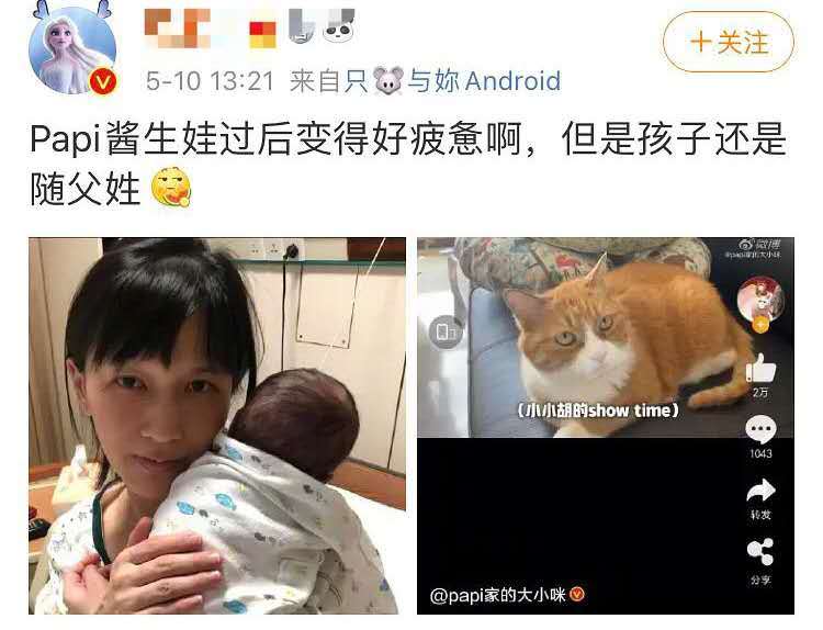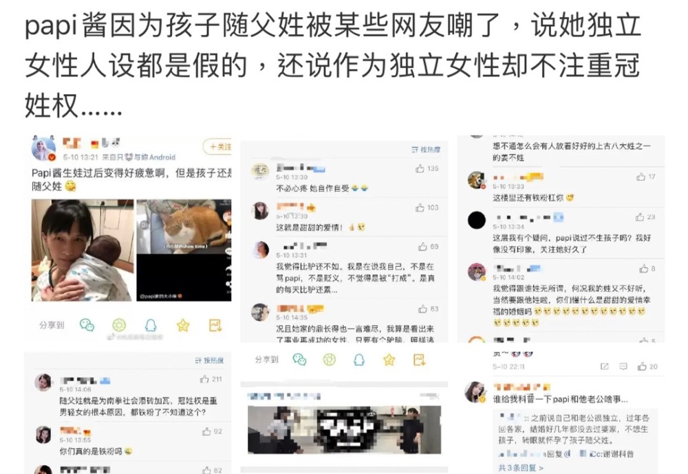 不过却有一部分网友就此嘲讽papi酱作为独立女性,孩子却随父姓,很不应该。