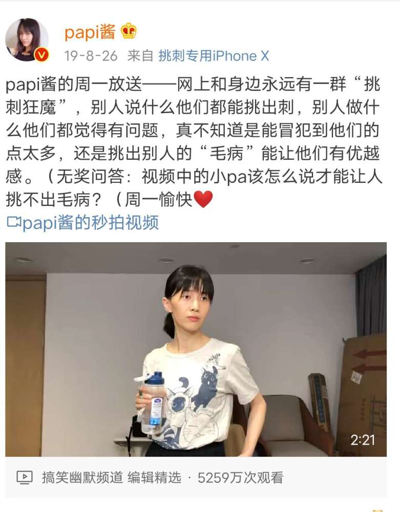在那条“挑刺狂魔”视频的配文中,papi酱写到:“网上和身边永远有一群“挑刺狂魔”,别人说什么他们都能挑出刺,别人做什么他们都觉得有问题,真不知道是能冒犯到他们的点太多,还是挑出别人的“毛病”能让他们有优越感。”还询问网友“该怎么说才能让人挑不出毛病?”
