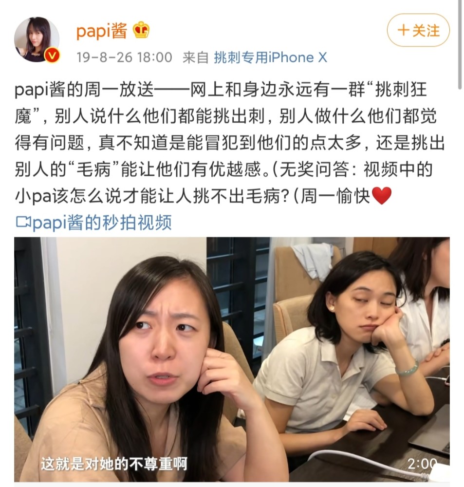 papi酱的周一放送网上和身边永远有一群“挑刺狂魔”,别人说什么他们都能挑出刺,别人做什么他们都觉得有问题,真不知道是能冒犯到他们的点太多,还是挑出别人的“毛病”能让他们有优越感。