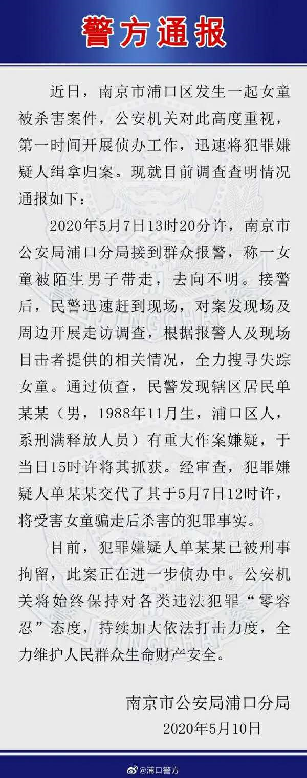 5月10日深夜,南京市公安局浦口分局官方微博@浦口警方 发布通报,浦口区发生一起女童被杀害案件,公安机关已将犯罪嫌疑人缉拿归案。犯罪嫌疑人单某某1988年出生,系刑满释放人员,其交代了将受害女童骗走后杀害的犯罪事实。目前,犯罪嫌疑人已被刑事拘留,此案正在进一步侦办中。