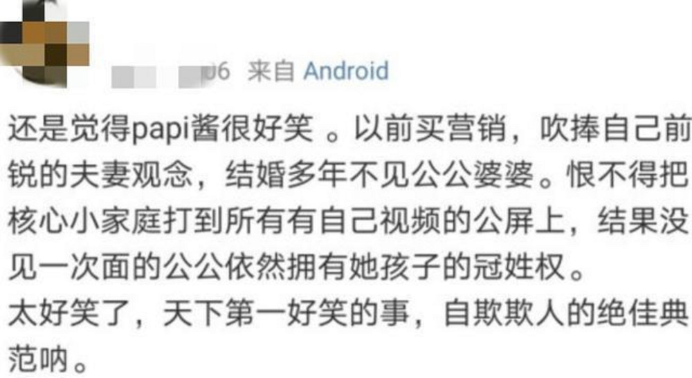 结果生下孩子以后孩子的姓还是随了父亲,这一举动不免的引起了网友的讽刺,觉得papi酱只会嘴上说说女奴主义,却还是逃不过随父姓,追随大男子主义的”婚驴型妻母“。