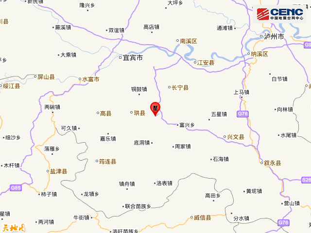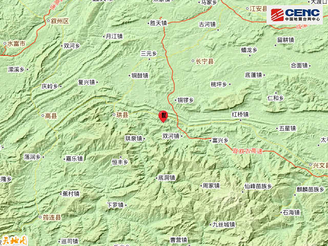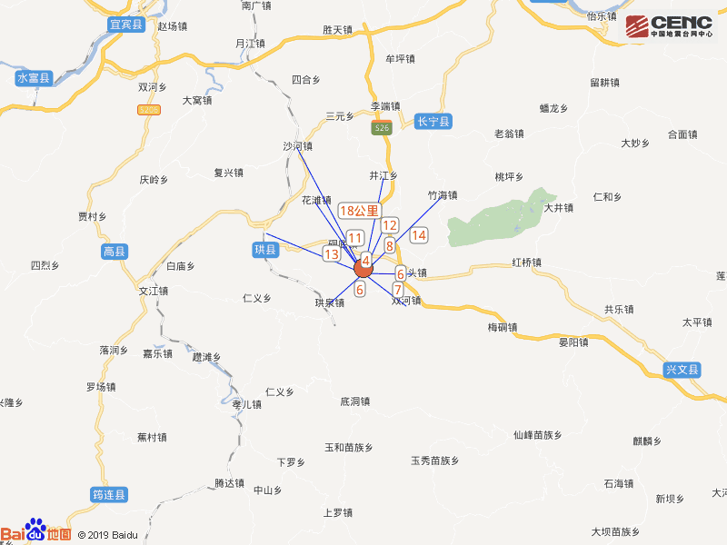 周边县城:震中距珙县13公里、距长宁县20公里、距高县32公里、距江安县40公里、距兴文县41公里,距宜宾市42公里,距重庆市210公里。