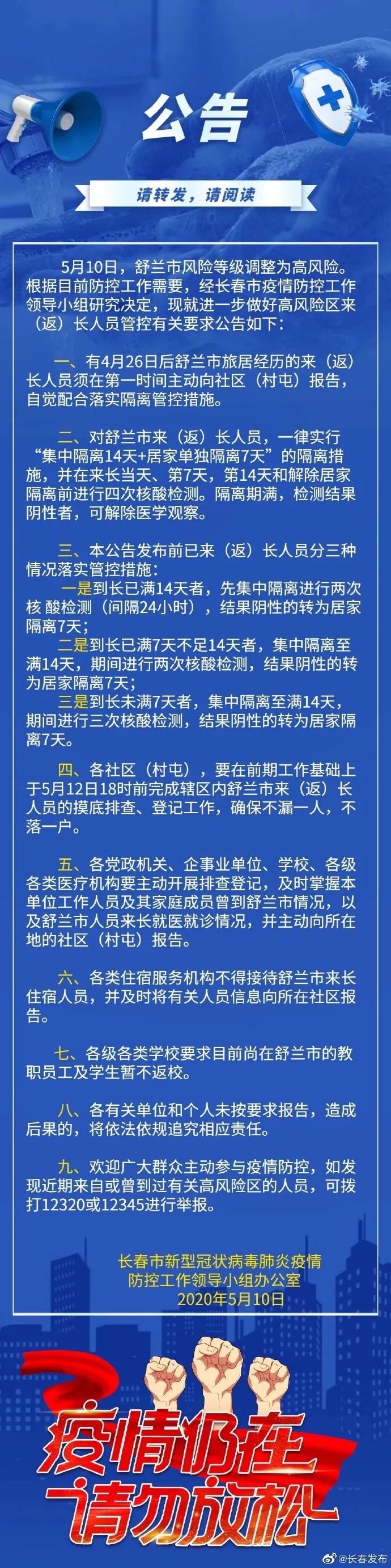 5月10日,舒兰市风险等级调整为高风险。11日,长春市疫情防控工作领导小组发布公告称,对舒兰市来(返)长春人员,一律实行 “集中隔离14天+居家单独隔离7天”的隔离措施。各社区(村屯),要在前期工作基础上于5月12日18时前完成辖区内舒兰市来(返)长春人员的摸底排查、登记工作。
