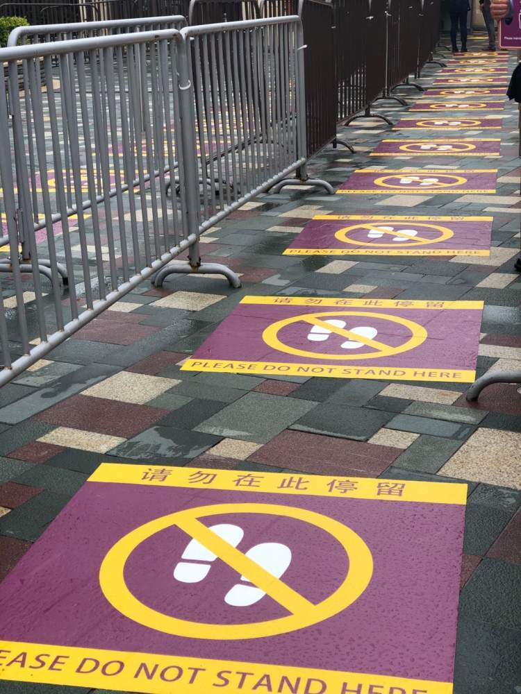 对游客来说,游玩过程中最大的注意事项就是保持适当距离排队。在各景点、小食亭、餐厅、商店收银台、游船座椅等处,都贴上了黄色分隔线,迪士尼演职人员会手举提示牌,提醒游客按黄线规定排队等候,不要聚集。