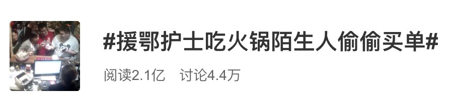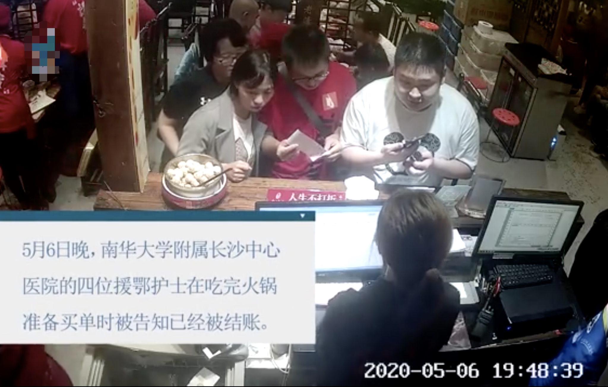 南华大学附属长沙中心医院的4位援鄂护士去吃火锅,在餐桌上聊起了武汉金银潭医院的工作经历。等吃完准备买单时,却被告知已经有人替他们付账了。
