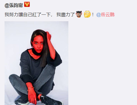 而今天早上张钧甯发微博说到:“我努力让自己红一下,我尽力了!”(并把自己的这张照片p的通红,这也太逗了吧)