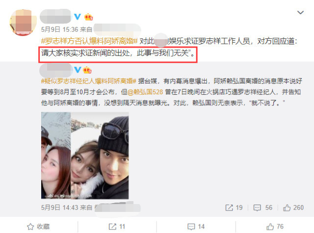 对于这种脑洞大开的猜测,该好友还煞有其事的解释阿娇和赖弘国签完分居协议后原定8月份到10月份之间官宣,谁料7号晚上赖弘国偶遇罗志祥经纪人还说漏了自己已和阿娇离婚的消息,8日早上赖弘国就接到了媒体的求证电话,因此该友人怀疑是罗志祥方为了转移注意力故意曝出两人的离婚消息。对此罗志祥经纪公司也直接做了否认,表示“请大家核实求证新闻的出处,此事与我们无关”。