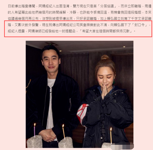 虽然不是罗志祥经纪人爆的料,但阿娇与赖弘国离婚消息被提前曝出也明显让两人措手不及。赖弘国率先承认发千字长文回应后,又数次对外发声,台媒透露这让阿娇经纪公司也非常不满。不仅经纪公司向赖弘国下了“封口令”让其不要再出声,阿娇律师也代替阿娇向他发了一封提醒函,表示“希望在这个时间大家都能保持沉默”。阿娇方明确表示不再对婚姻事宜做任何回应,又明里暗里提醒赖弘国也保持沉默,看来媒体和网友要想知道两人具体的婚变细节似乎不太可能。