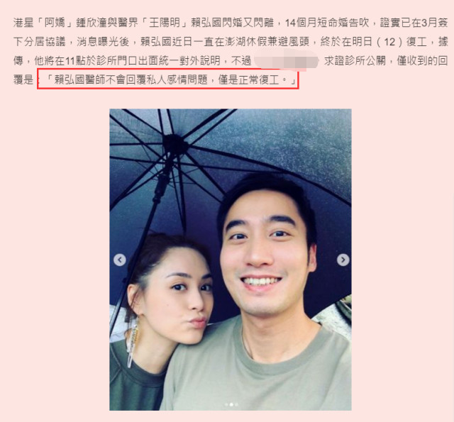 本以为赖弘国散心归来后会放下过往重新生活,谁料又有媒体爆料他复工后的首件事就是召开记者会谈婚变详情,这似乎也打脸了说好“不再做任何回应”的赖弘国。不过媒体爆料真真假假,赖弘国召开记者的消息也有待考证,为了让网友们谨慎吃瓜,有台媒专门向赖弘国所在的医美诊所求证。对于赖弘国召开记者会谈婚变细节的事情,赖弘国所在诊所也仅回复“赖弘国医生不会回复私人感情问题,单纯是正常复工而已”。