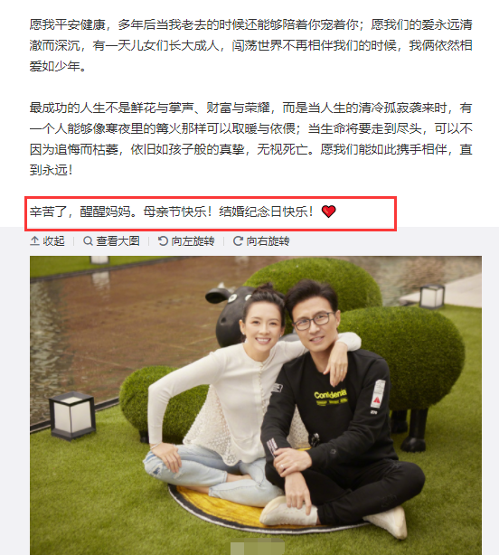 汪峰感谢章子怡的相伴相互依偎,他希望和章子怡一起携手到老,并且无惧死亡,无论人生高峰低谷,都有一个她陪伴,汪峰祝福醒醒妈妈章子怡母亲节快乐,还有结婚纪念日快乐!