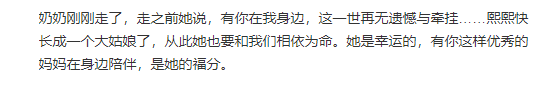 除此之外汪峰还提到“奶奶刚刚走了,走之前她说,有你在我身边,这一世再无遗憾与牵挂……熙熙快长成一个大姑娘了,从此她也要和我们相依为命”。