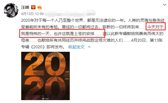 有网友指出,4月13日汪峰发文就已经暗示什么了“曾经的一切都将过去,崭新的一切终将到来……今天对于我是特殊的一天,也许这就是上苍的安排……谨以此新专辑献给我善良而伟大的母亲……”,当时网友就在鼓励汪峰。