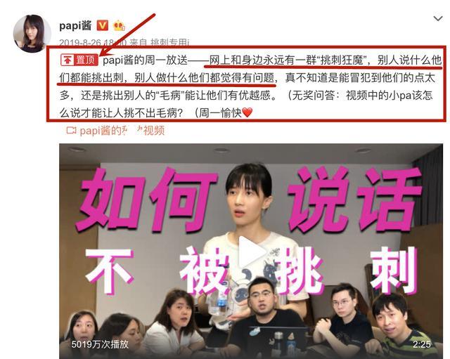 Papi酱的视频结合配文"网上和身边永远有一群挑刺狂魔,别人说什么他们都能挑出刺,别人做什么他们都觉得有问题,真不知道是能冒犯到他们的点太多,还是挑出别人的毛病能让他们有优越感",疑似巧妙地回怼恶评。