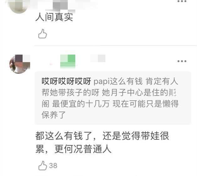 做妈妈的辛苦不少人都感同身受,于是papi酱的评论区变成大型恐育现场,更有人哀叹连papi酱这样的高收入网红女星生了孩子都这样操劳憔悴成这样,更不用提普通人了。