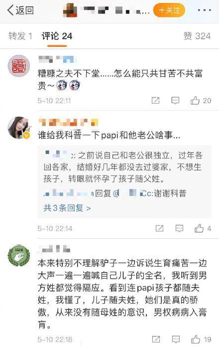儿子不该随爸姓?网红papi酱(姜逸磊)生产后久未露面,难得在母亲节发文晒照,却风波不断,甚至因为儿子跟着丈夫姓被部分网友质疑独立女性人设崩塌。