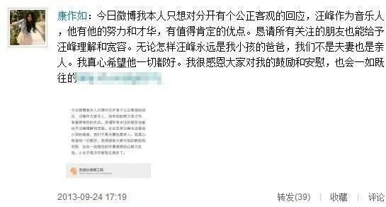 但这样的满意,依旧没能让她与汪峰的婚姻变得长久,2013年3月8日,康作如便收到汪峰单方面提出离婚的消息。
